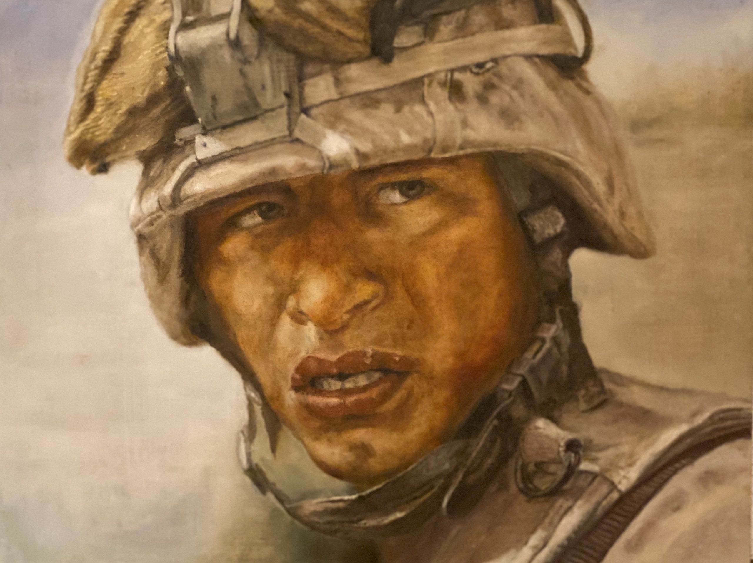 Geschilderd met olieverf op paneel. Studieportret naar foto van Joe Raedle, dit is niet te koop